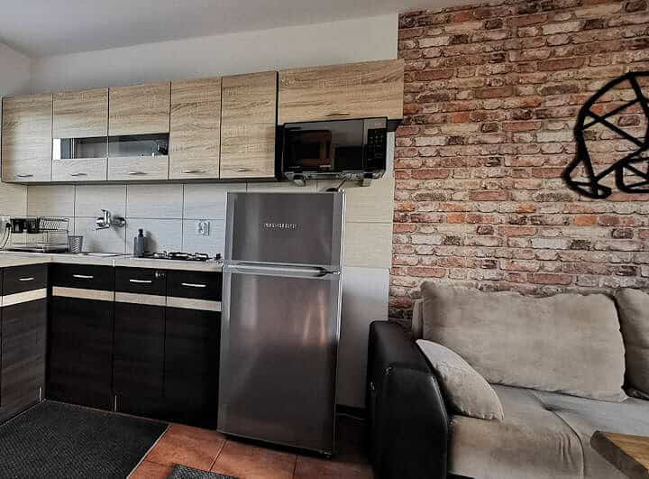 Kuchnia jest w pełni wyposażona (kawa, herbata, podstawowe przyprawy), posiada kuchenkę gazową, lodówkę, czajnik elektryczny, mikrofalówkę, przelewowy ekspres do kawy, toster, opiekacz do kanapek, komplet naczyń, garnków i patelnie.
