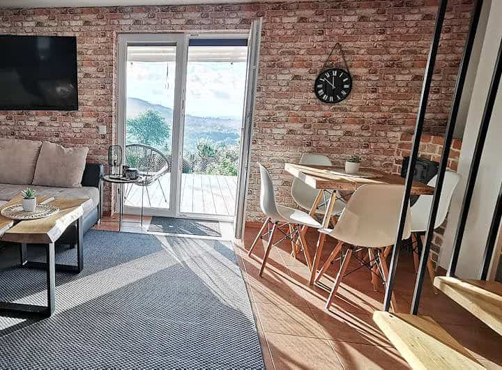 Domek ugości 5 gości, jest dwupoziomowy, w pełni wyposażony z widokowym tarasem z którego można podziwiać cudowne zachody słońca.