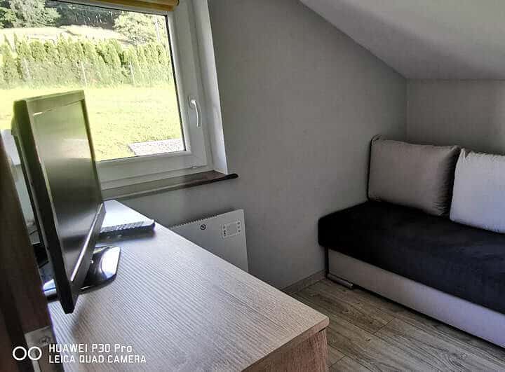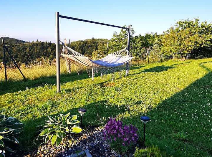 Na zewnątrz do dyspozycji oddajemy przytulny taras z cudnym widokiem, hamak, grill, miejsce na ognisko oraz mini boisko do piłki nożnej z dwoma bramkami.